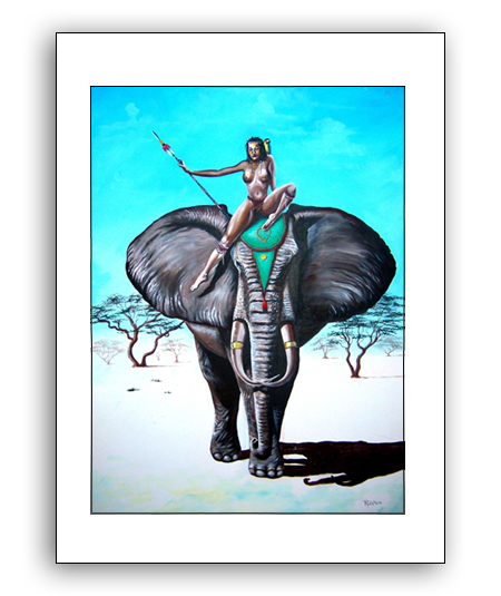 In Alter Ego, a powerful nude warrior woman confidently straddles the head of a majestic elephant, spear in hand, poised against a bright turquoise sky. Set in an abstract African savanna, the image evokes themes of strength, freedom, and duality --- a striking contrast to Ray Rolston's typical island palette.